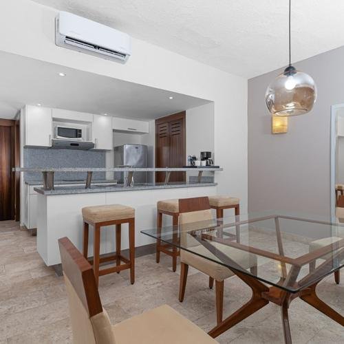 63 m2, ocupación máxima 4 personas, cuenta con cocineta y equipo básico de cocina, con cama king size & sofá cama. Vista al resort, así como diversos servicios y acceso al Hotel Krystal Grand® Los Cabos.